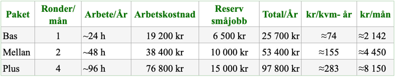 innebär en årlig kostnad på 25 700 kr (≈ 2 100 kr/månad) och ger en trygg grundtillsyn som minskar risken för större skador och säkerställer fastighetens långsiktiga värde.